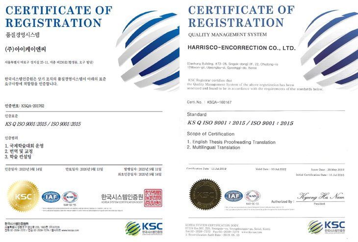 하리스코는 영문논문교정, 다국어 번역 서비스 분야에 대해 ISO 9001:2015 인증을 받았습니다.