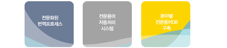 | 전문화된 번역 프로세스 | 전문적이고 안정적인 시스템을 위하여 자체 번역 품질관리 부서를 운영 중에 있으며, 품질 관리 및 시스템 개발을 위해 노력하고 있습니다. |